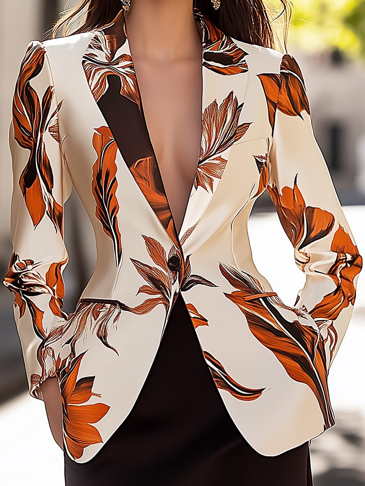 To create a polished and fashion-forward look, pair the Fashion-Forward Autumn Leaf Satin Print Blazer with a sleek, neutral-colored blouse or turtleneck in shades such as beige or cream. Complement the blazer with tailored trousers or a high-waisted skirt in coordinating tones to highlight the autumnal print. Complete the outfit with classic black heels and understated accessories to maintain a refined appearance.